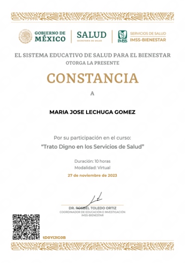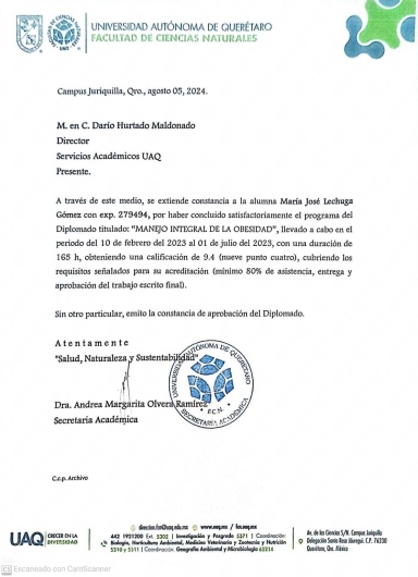 Mi nombre es María José Lechuga Gómez, soy Licenciada en Nutrición por la Universidad Autónoma de Querétaro. Realicé mi Servicio Social en el Hospital General de Querétaro, específicamente en el área clínica. Durante mis estudios, completé el Diplomado en Manejo Integral de la Obesidad, ofrecido por la UAQ, así como el Diplomado en Educación en Diabetes de la Universidad Anáhuac. Asimismo, llevé a cabo mis prácticas profesionales en la Clínica de Nefrología y Diálisis, en el ISSSTE, en el IMSS, y en una clínica de la UAQ.